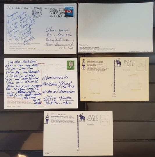 A Group of 5 Postcards From Vancouver, BC, Showing Vancouver Skyline, From The 1960's to 1990's, Overall Fine and VF, Net Est. $2