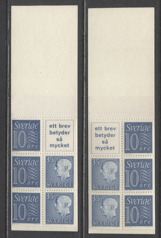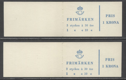 Sweden SC#586c (Facit #HA11BRH)/586c (Facit #HA11BRV) 1963 King Gustav VI Adolf Definitive Issue, With Inscribed Labels, Upright Panes, 10 Ore Stamps At Right and Left, Repeating Text Cover, 2 VFNH Booklets of 6 (2 +3 + Label), Estimated Value $5