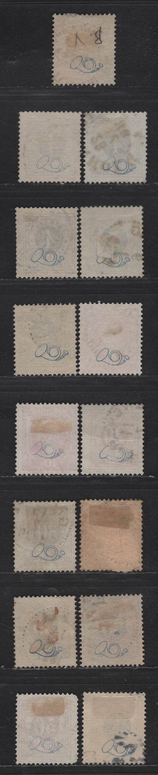 Sweden SC#40, 42-43, 45-a, 46-49 2o - 1k Orange - Bister & Dark Blue Numeral, 1886-1891 Numeral Issue With Posthorn On Back, 15 Fine Used Singles, Includes Several Shades