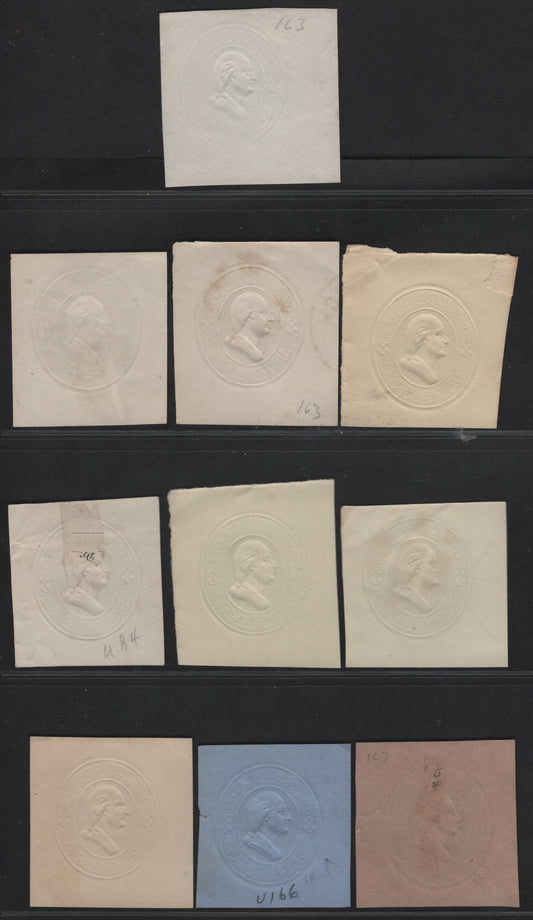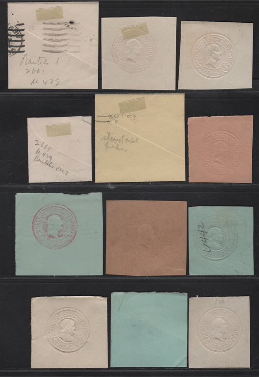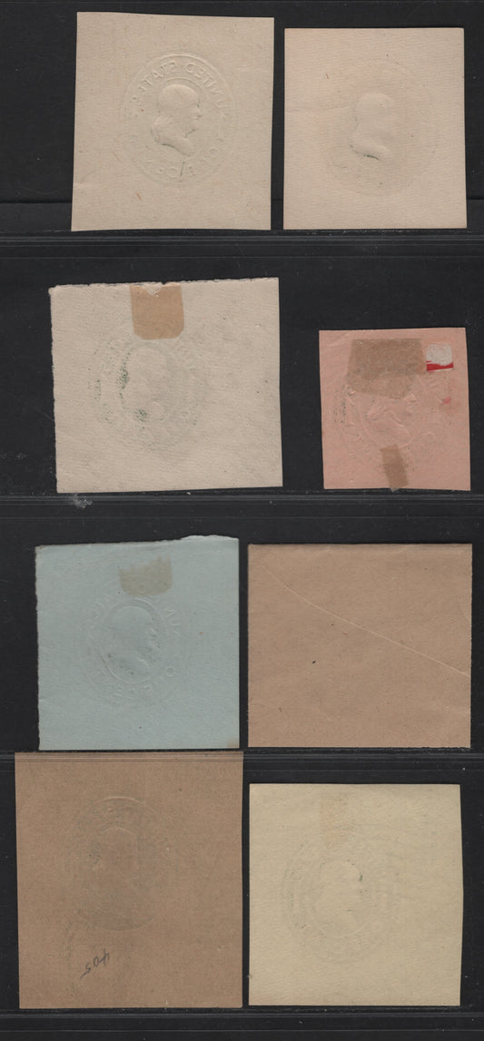 United States Of America #U311-U313 2c Green, Deep Green, Bluish Green George Washington, 1887-1894 Plimpton Issue, 8 Fine & VF Used Singles Die 2 On White, Amber, Manila, Blue & Oriental Buff Papers