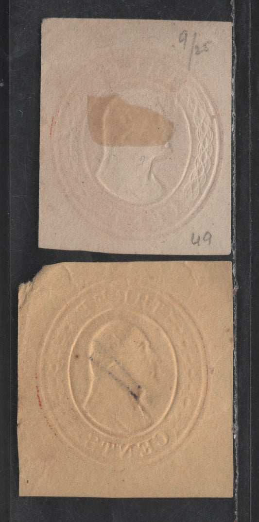 United States SC#U9, U9var 3c Red Washington, 1853-1855 Nesbitt Issue, 2 Fine Used Singles, White & Unlisted Pale Yellow Papers, 14.5mm Label At Top