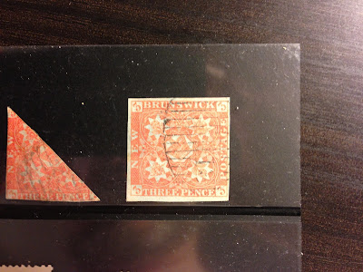 Occasionally if the supply of a particular stamp ran out postmasters would improvise by taking a higher denomination and cutting it into halves, thirds or quarters. This was done in New Brunswick in the 1850's when there was a need for one and a half penny stamps. Sometimes a threepenny stamp would be cut in half diagonally to make a 1.5d stamp. This is known as a bisect.