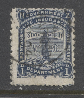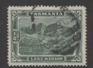 A bootheel cancellation is a postmark that resembles a boot print. Technically, most barred numeral cancels fall into this category, but generally this term tends to be reserved for those cancellations which do not contain numerals. The Tasmanian stamp above, which was issued in 1899 is cancelled with a bootheel marking in which the word "Hobart" (the capital) is contained. This would have been one of the most common postmarks at the time.