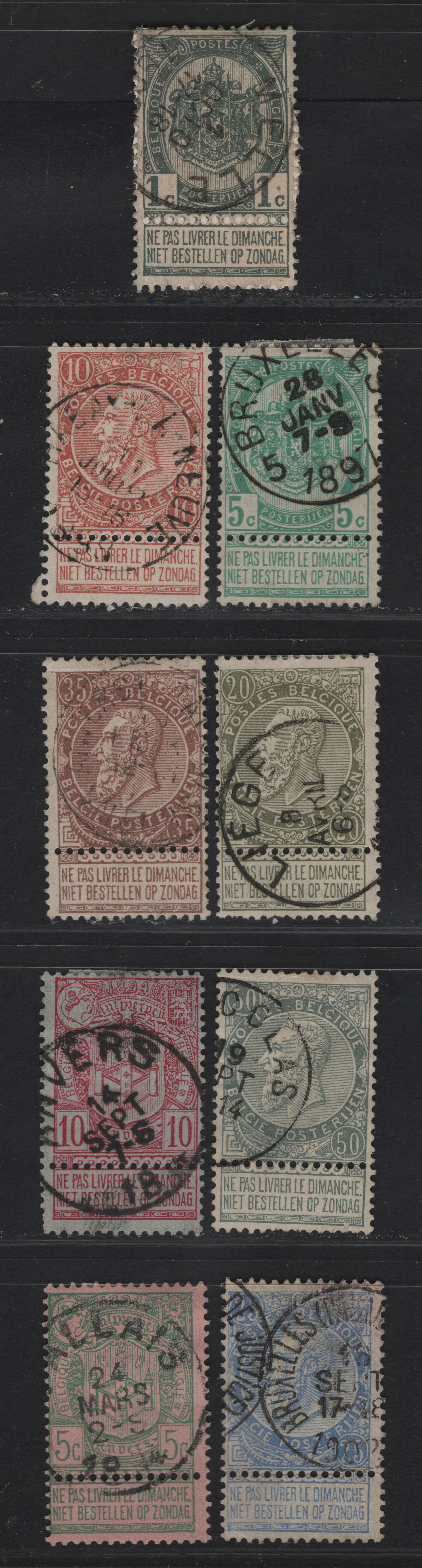 Lot 103 (C) Belgium SC#60, 64-69, 71, 76-77 1c - 10c Gray - Carmine on Bluish Sunday Labels - Antwerp Exhibition, 1893-1900 Sunday Labels - Antwerp Exhibition Issues, 10 Fine/Very Fine Used Singles, 30c With A Shallow Thin