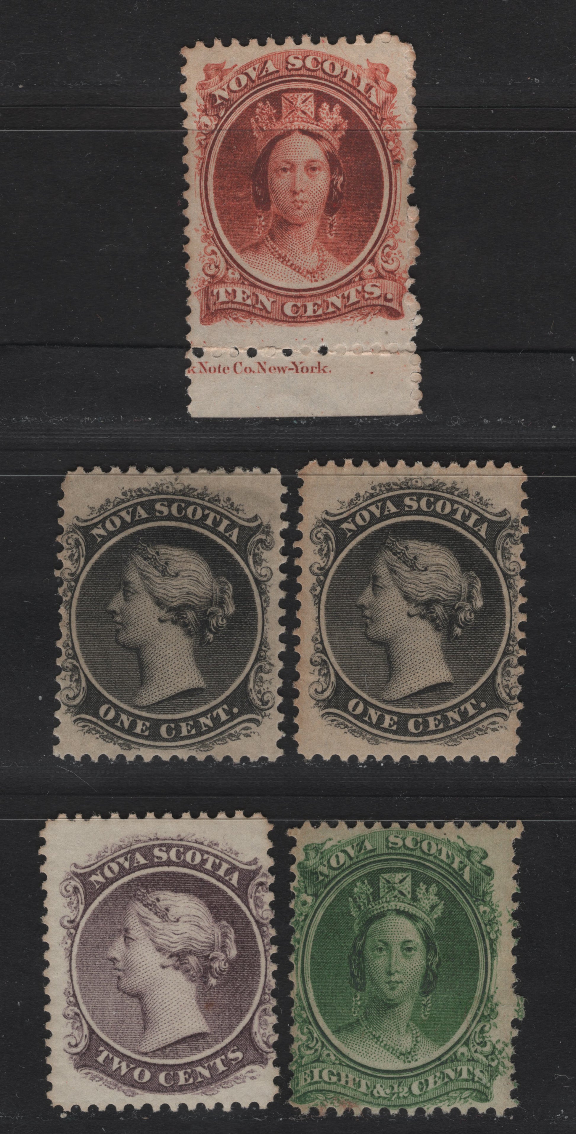 Lot 12 Nova Scotia #8a,9,11,12, 1860-1867 Cents Issue, 4 VG&F OG&NH Singles 1c Black,2c Lilac On Cents-N, Perf 11.75x12, 8 1/2c Green & 10c Vermilion On Paper Cents-L, Perf 11 3/4. 2c Is NH