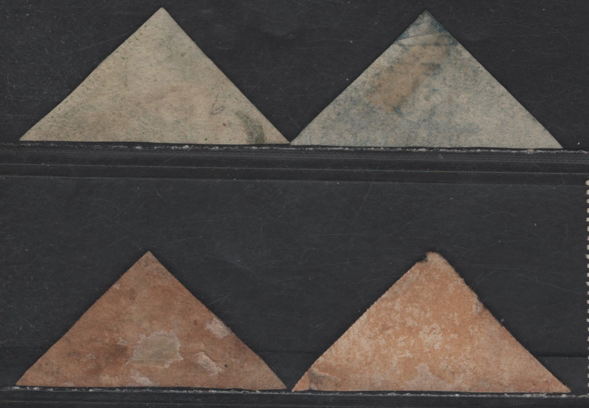 4 ungraded singles of the 1d - 1/- deep carmine red - bright yellow green Reclining Hope from the 1855-1864 Triangular Reclining Hope Issues, white paper, Perkins Bacon & De La Rue printings, all with no margins or small faults.