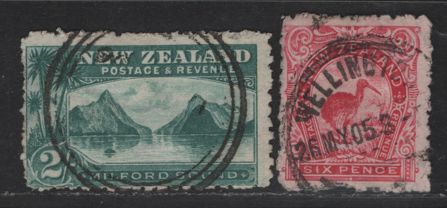 Lot 15 (C) New Zealand SG#312b, 316b 6d - 2/- Bright Carmien Rose - Blue Green Brown Kiwi - Milford Sound, 1902-1907 Pictorial Issue, 2 Fine Used Singles, Wmk NZ & Star (#43), Perf 11