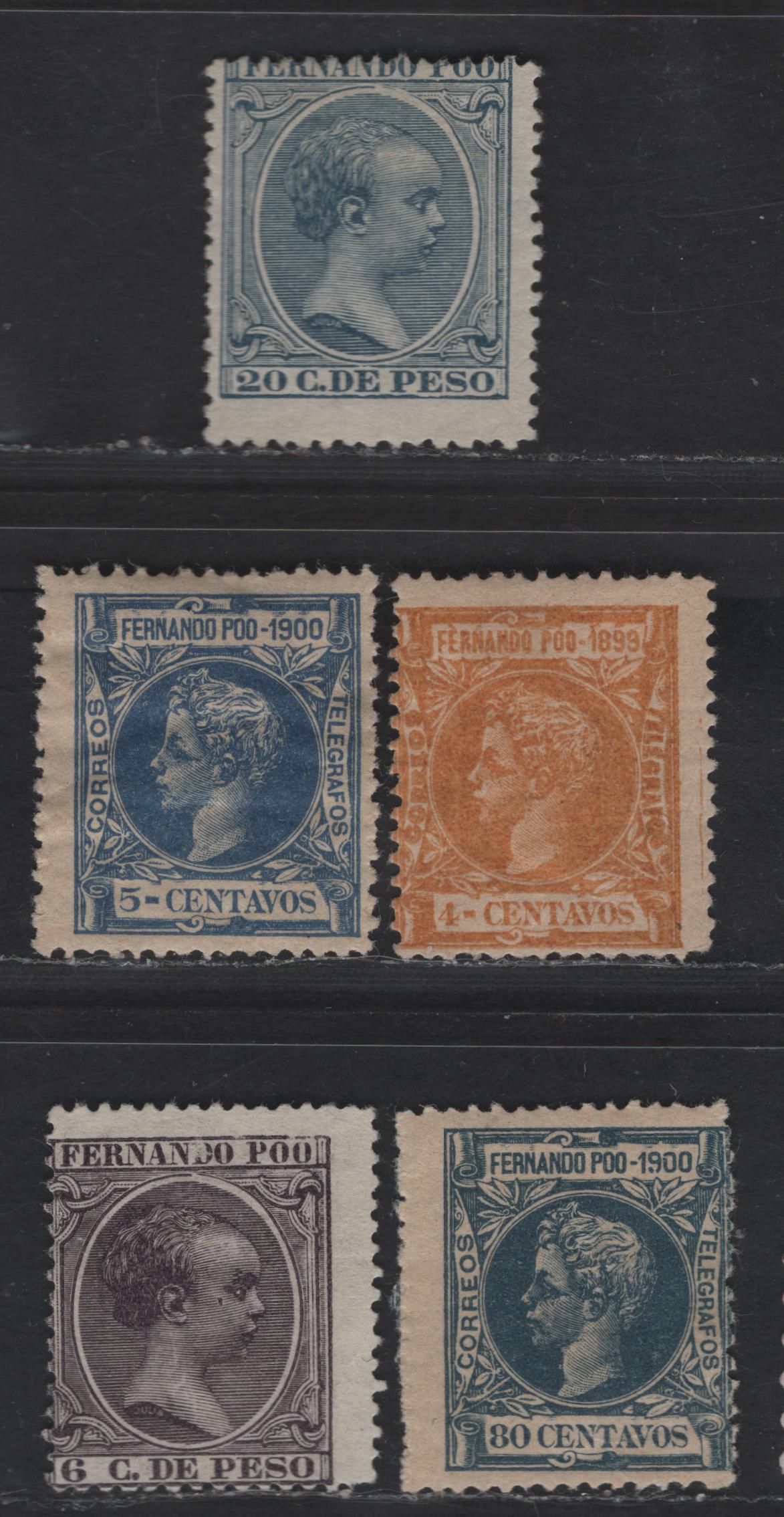 Lot 160 Fernando Po SC#16, 21, 52, 75, 83 6c - 80c Dark Violet - Dark Blue King Alphonso XIII, 1894-1900 King Alphonso XIII Issues, 5 VG/FOG & Unused Singles, The 1894-97 Issues Have No Gum