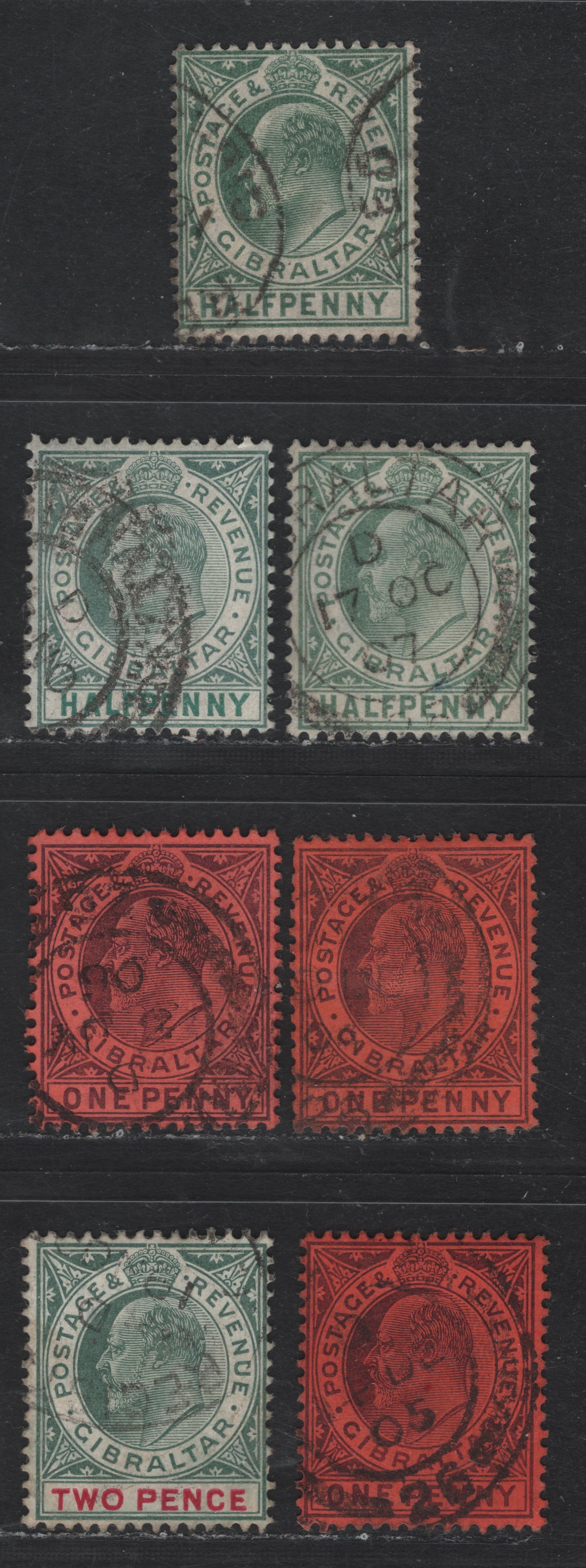 Lot 184 Gibraltar SG#56-a, 57-a, 58a 1/2d - 2d Dull & Bright Green - Gray Green & Carmine King Edward VII, 1904-1908 King Edward VII Issue, 5 Fine/Very Fine Used Singles, Multiple Crown CA Wmk, Ordinary & Chalky (2d) Papers