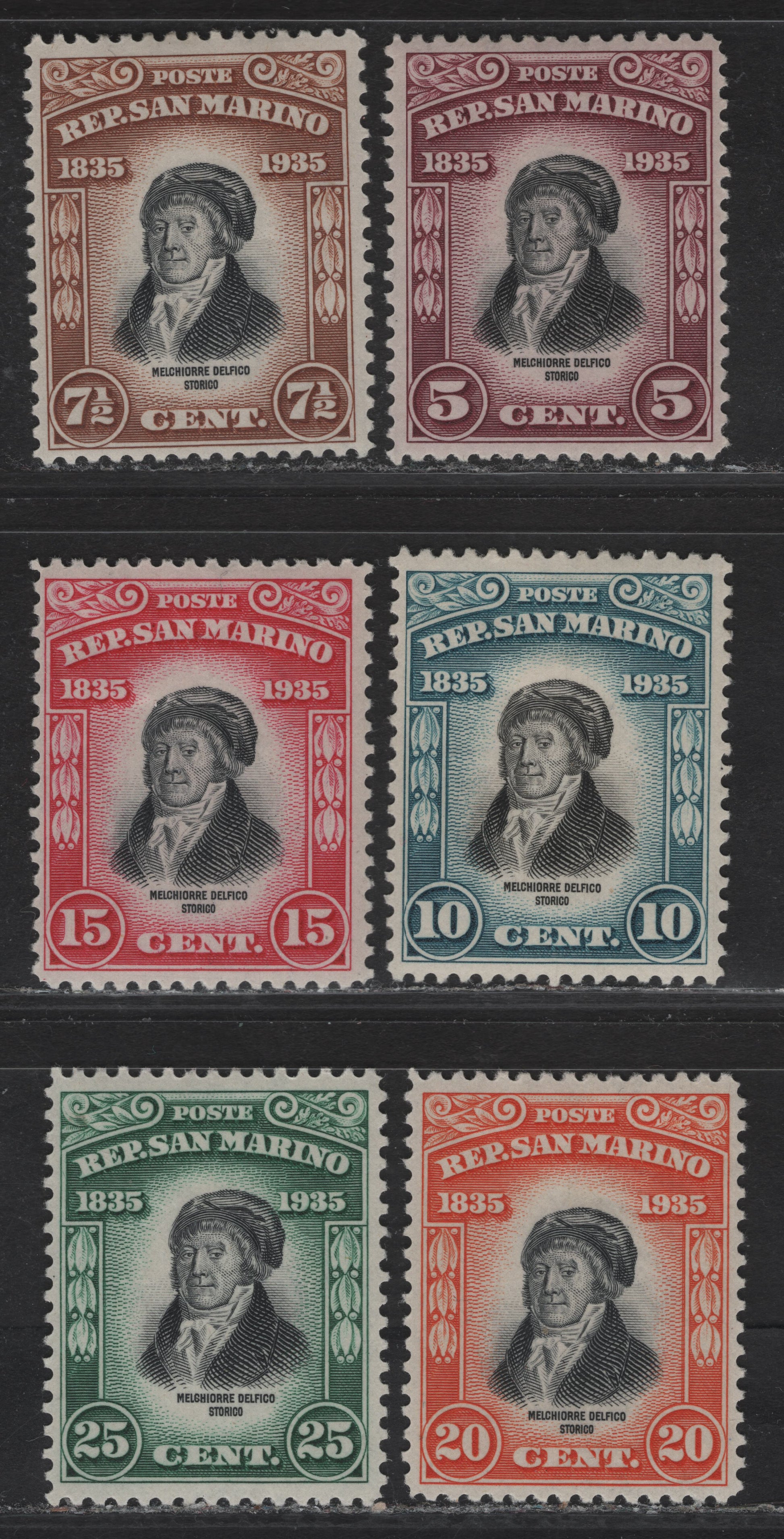Lot 19 San Marino SC#169-174 5c - 25c Brown Lake & Black - Green & Black Melchiore Delfico, 1935 Melchiore Delfico Issue, 6 F/VFOG Singles