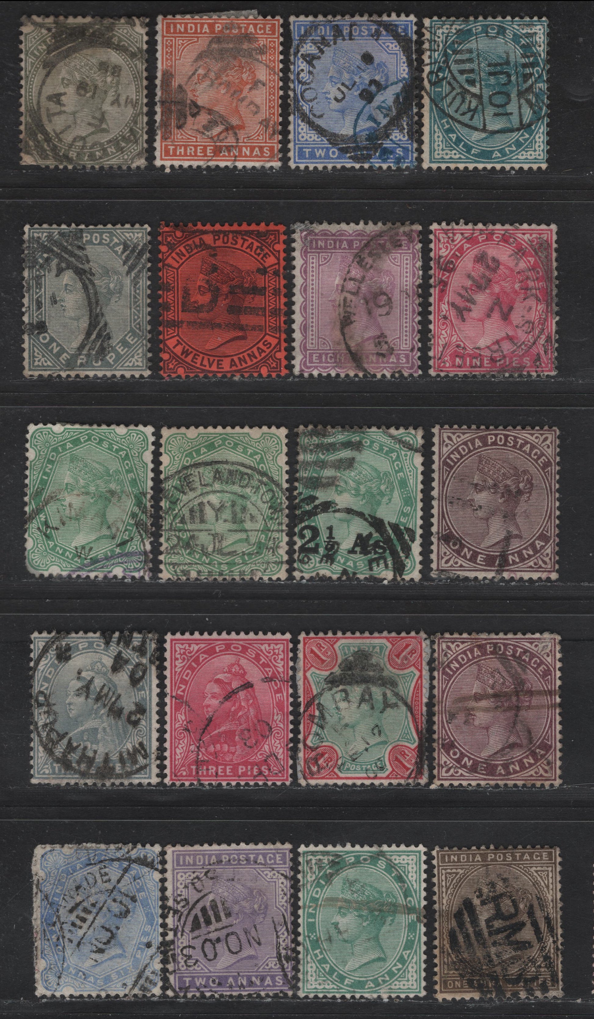 Lot 206 (C) India SG#84, 87-89, 90, 92, 94-95, 98, 100-104, 106, 111-112, 114, 116, 118 1/2a - 2a6p Deep Blue Green - Ultramarine Queen Victoria, 1882-1902 Queen Victoria Keyplates Issue, 20 Fine/Very Fine Used Singles