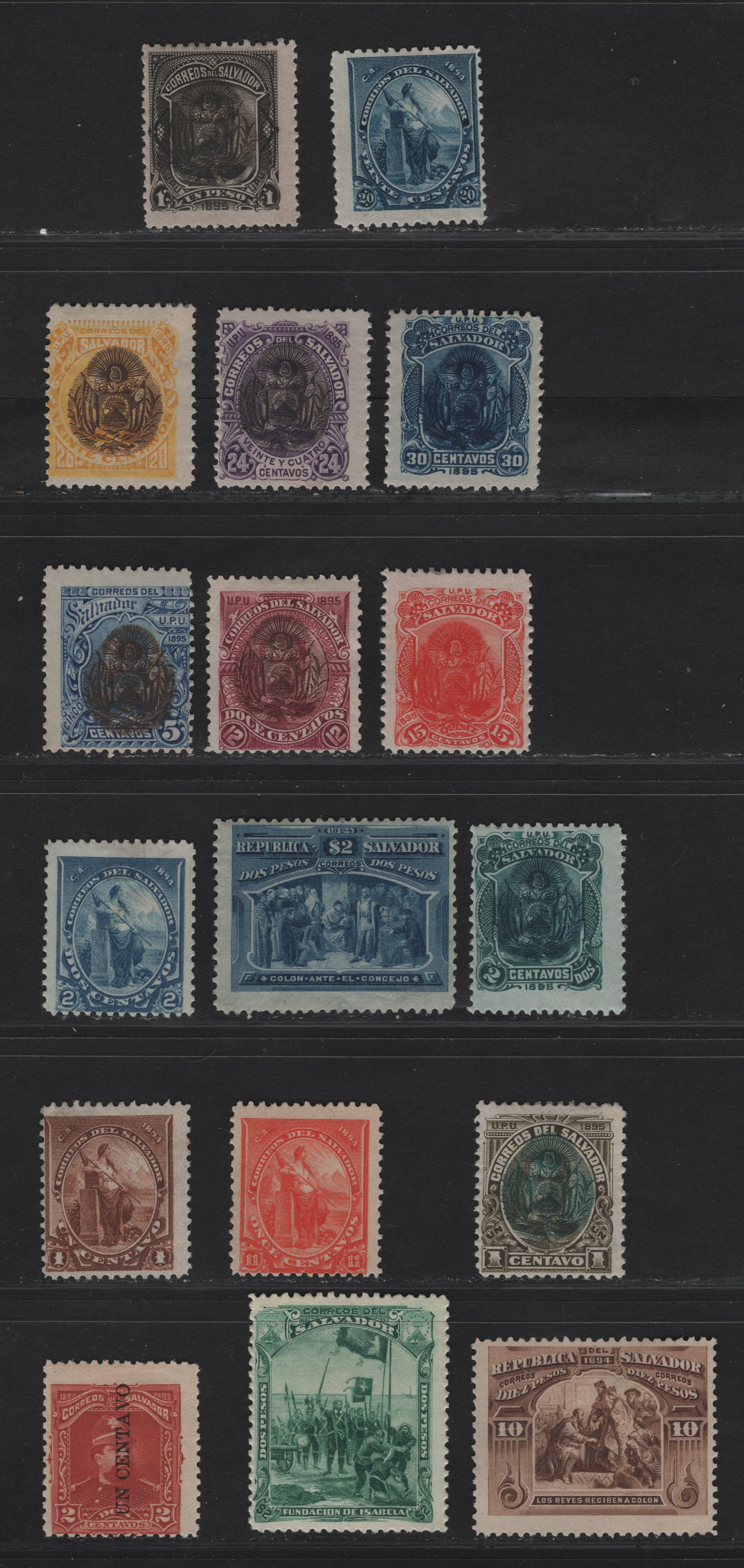 Lot 269 El Salvador SC#91-92, 96-97, 101, 103, 105-106, 108, 110-114, 116 2p - 1p Green - Black & Brown Columbus - Arms, 1893-1895 Columbus - Arms Overprinted Issues, 17 FOG & Unused Singles
