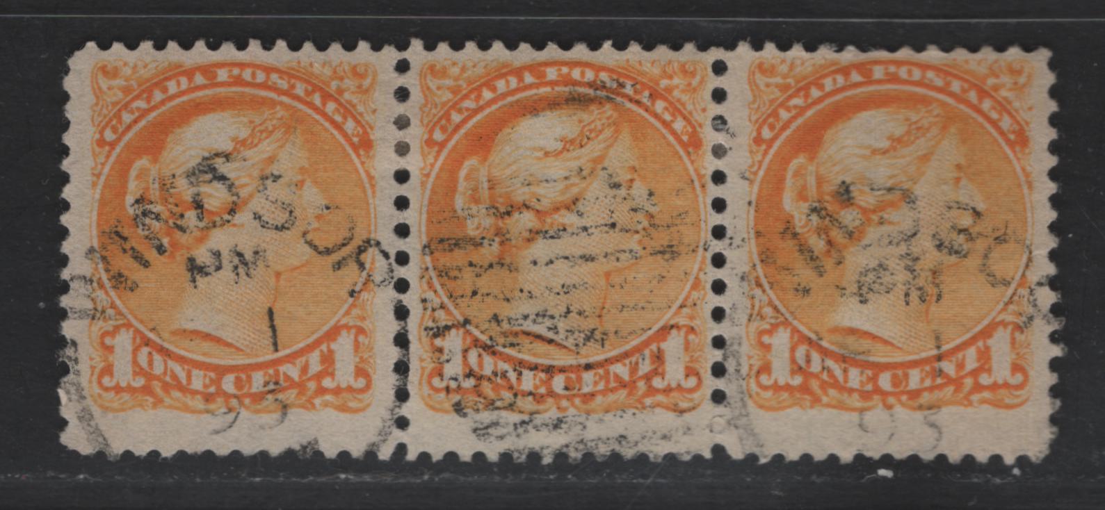 Lot 325 Canada #35ii 1c Orange Queen Victoria, 1870-1897 Small Queen Issue, A Fine Used Strip of 3 Mid Second Ottawa Printing On Paper Type 2O-S, See Page On Small Queen Papers For Details, April 1, 1893 Windsor, ON Cancel