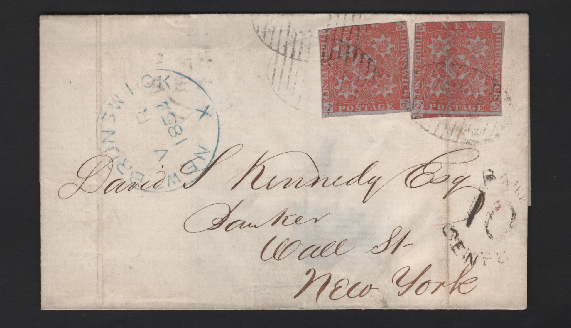 Lot 292 (C) New Brunswick #1 3d Red Crown & Heraldic Flowers, 1851-1860 Pence Issue, A Fine Cover Franked With 2 Good-VG Singles, Sent From Saint John To NY, Clear Strike Of Blue VR CDS, Listed In Jarett As Cancel Type #261, Scarce