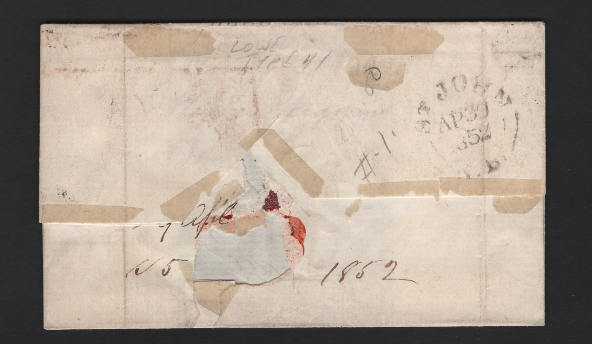 A fine cover of the 3d red Crown & Heraldic Flowers from the 1851-1860 Pence Issue franked with 2 good-vg singles, sent from Saint John to NY, clear strike of blue VR CDS, listed in Jarett as cancel type #261, scarce. There is a vertical file fold, which affects the right hand stamp. Both stamps have clear margins on 3 sides, but cut just slightly in on the top margins. Both are tied to the cover by generic oval barred grid cancels. There is a nice strike of a large blue CDS which Reads " New Brunswick VR 1852 X in three lines. This cancel is listed in Jarett at $1.25 on cover, which is the same price that a 20c Quebec Tercentenary was listed at in the same catalogue. So, in today's money that is about $100 cancel. There is a black arched "Paid 10 Cents" handstamp on the front, which most cross-border mail at the time had and an April 30, 1852 St. John CDS originating cancel on the back. There are no arrival backstamps. The folded envelope has no edge tears or major stains.