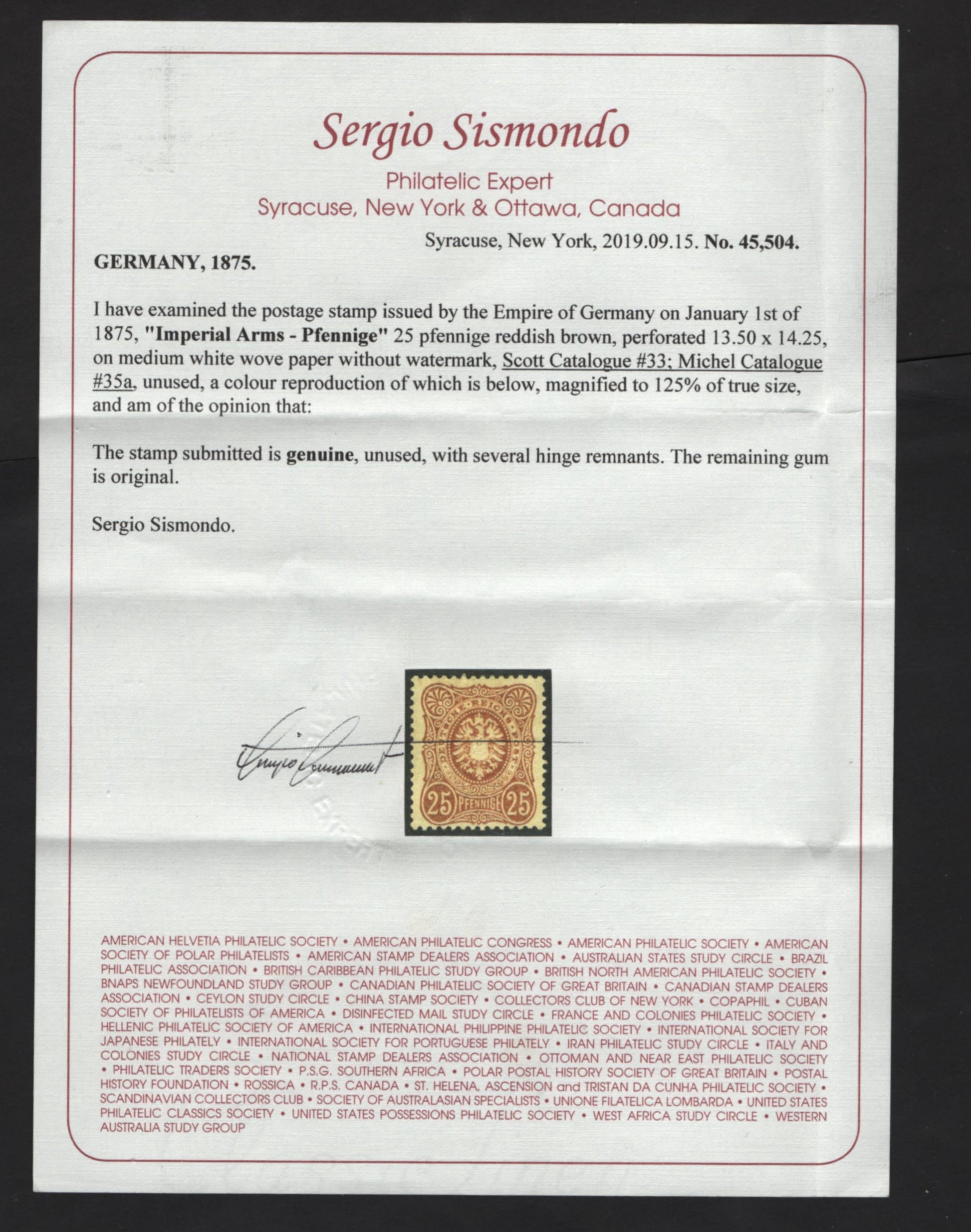 Lot 8 Germany SC#33 25pf Red Brown Eagle & Arms, 1875-1877 Embossed Eagle Arms Issue, A VFOG Single, Final 'E' on Pfenninge